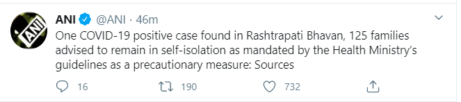समाचार एजेंसी आइएएनएस ने मामले के जानकार सूत्र के हवाले से जानकारी दी है कि राष्ट्रपति भवन एस्टेट क्वार्टर के निवासी के एक रिश्तेदार की कुछ दिनों पहले मृत्यु हो गई थी। रविवार को कोरोना वायरस से संक्रमित पाया गया व्यक्ति अंतिम संस्कार में शामिल हुए था। व्यक्ति को पास के बिड़ला मंदिर परिसर के करीब क्वारंटाइन सेंटर में भेजा गया है।